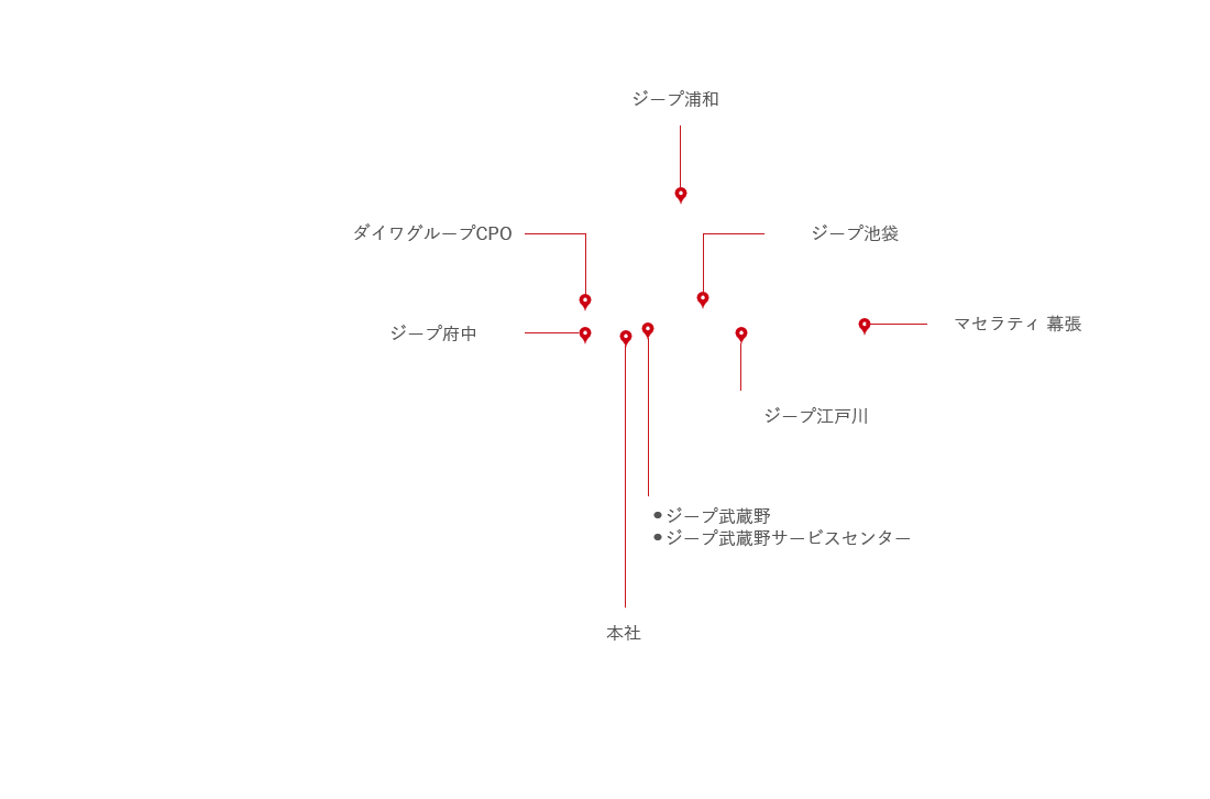 株式会社ファイブスター東都 本社 〒182-0024 東京都調布市布田4丁目6-1 調布丸善ビル3F 042-440-8311 MAP ジープ府中 〒183-0031 東京都府中市西府町2-21-1 042-352-3111 MAP SHOP INFO ジープ武蔵野 〒181-0002 東京都三鷹市牟礼7-1-31 0422-40-5211 MAP SHOP INFO ジープ武蔵野サービスセンター 〒181-0004 東京都三鷹市新川3-16-25 0422-70-6611 MAP SHOP INFO ジープ池袋 〒173-0026 東京都板橋区中丸町53-15 ヒルトップ・スクエアー1F 03-3530-0511 MAP SHOP INFO ジープ浦和 〒338-0836 埼玉県さいたま市桜区町谷1-20-20 048-840-5211 MAP SHOP INFO ジープ江戸川(フォード認定サービス) 〒134-0088 東京都江戸川区西葛西3-8-15 03-5878-0935 MAP SHOP INFO ダイワグループCPO 〒207-0003 東京都東大和市狭山5-1636-1 042-516-8717 MAP SHOP INFO