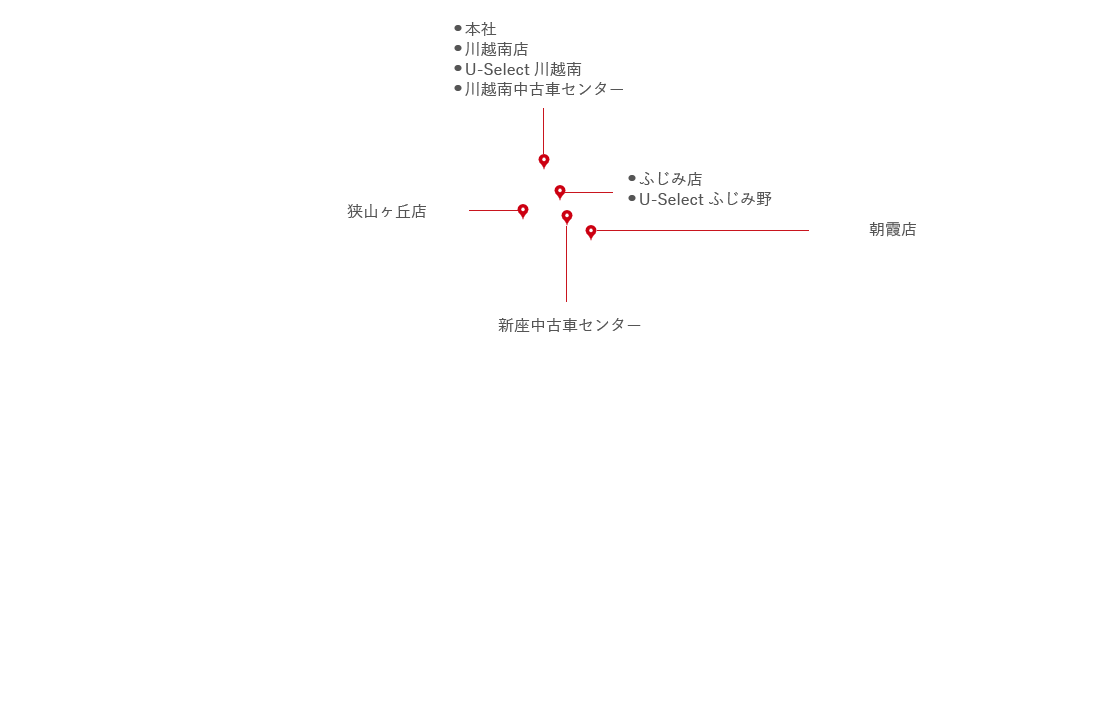 株式会社ホンダカーズ埼玉南 本社 〒350-1147 埼玉県川越市諏訪町15-1 049-241-3058 MAP SHOP INFO 川越南店 〒350-1142 埼玉県川越市藤間209-1 049-241-3500 MAP SHOP INFO 狭山ヶ丘店 〒359-1106 埼玉県所沢市東狭山ヶ丘4-2712-10 04-2928-8700 MAP SHOP INFO ふじみ店 〒354-0041 埼玉県入間郡三芳町藤久保935-5 049-258-0039 MAP SHOP INFO 朝霞店 〒351-0014 埼玉県朝霞市膝折町2-13-68 048-460-4500 MAP SHOP INFO U-Selectふじみ野 〒356-0053 埼玉県ふじみ野市大井1-6-6 049-256-8688 MAP SHOP INFO U-Select川越南 〒350-1142 埼玉県川越市藤間503-1 049-238-7155 MAP SHOP INFO 川越南中古車センター 〒350-1147 埼玉県川越市諏訪町15-36 049-249-5007 MAP SHOP INFO 新座中古車センター 〒352-0004 埼玉県新座市大和田2-5-4 048-423-5960 MAP SHOP INFO ららぽーと富士見ショールーム 〒354-8560 埼玉県富士見市山室1-1313 MAP SHOP INFO