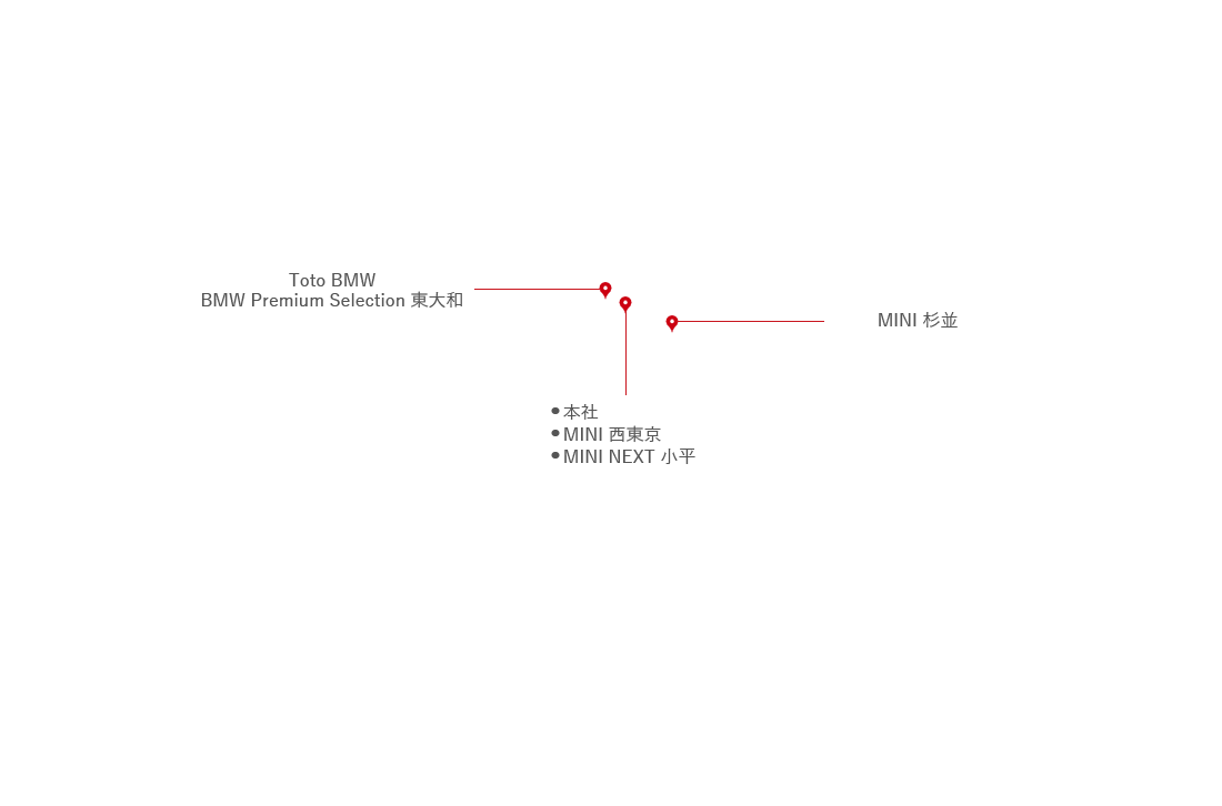 株式会社モトーレン東都 Toto BMW 西東京本社 〒203-0033 東京都東久留米市滝山3−11−2 042-475-1231 MAP SHOP INFO Toto BMWBMW Premium Selection 東大和 〒207-0004 東京都東大和市清水4-1125 042-562-2641 MAP SHOP INFO MINI 杉並 〒167-0041 東京都杉並区善福寺1-15-22 03-3397-3298 MAP SHOP INFO MINI 西東京 〒203-0034 東京都東久留米市弥生1-1-36 042-462-3298 MAP SHOP INFO MINI NEXT 西東京 〒187-0002 東京都小平市花小金井4-5-19 042-479-0357 MAP SHOP INFO